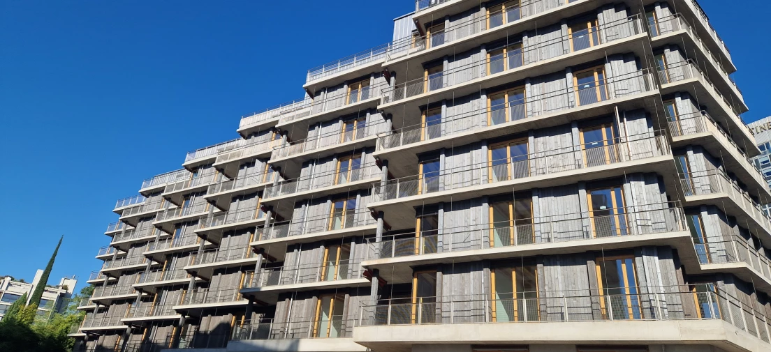 Le Crocodile se lit en trois strates : un socle en béton ; un corps principal en bois rythmé par les lignes horizontales des balcons en béton ; un attique en retrait habillé d’inox mat.